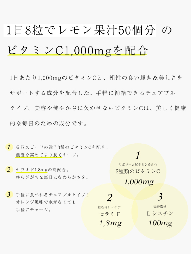 | 成分/原材料 | : | マルトース(国内製造)、ウコンエキス末、セラミド含有米抽出物(デキストリン、米抽出物)ビタミンE含有植物油/ビタミンC、結晶セルロース、甘味料(ステビア)、加工デンプン、シクロデキストリン、L-シスチン、ヒマワリレシチン、二酸化ケイ素、香料、ステアリン酸カルシウム、ビタミンA |
