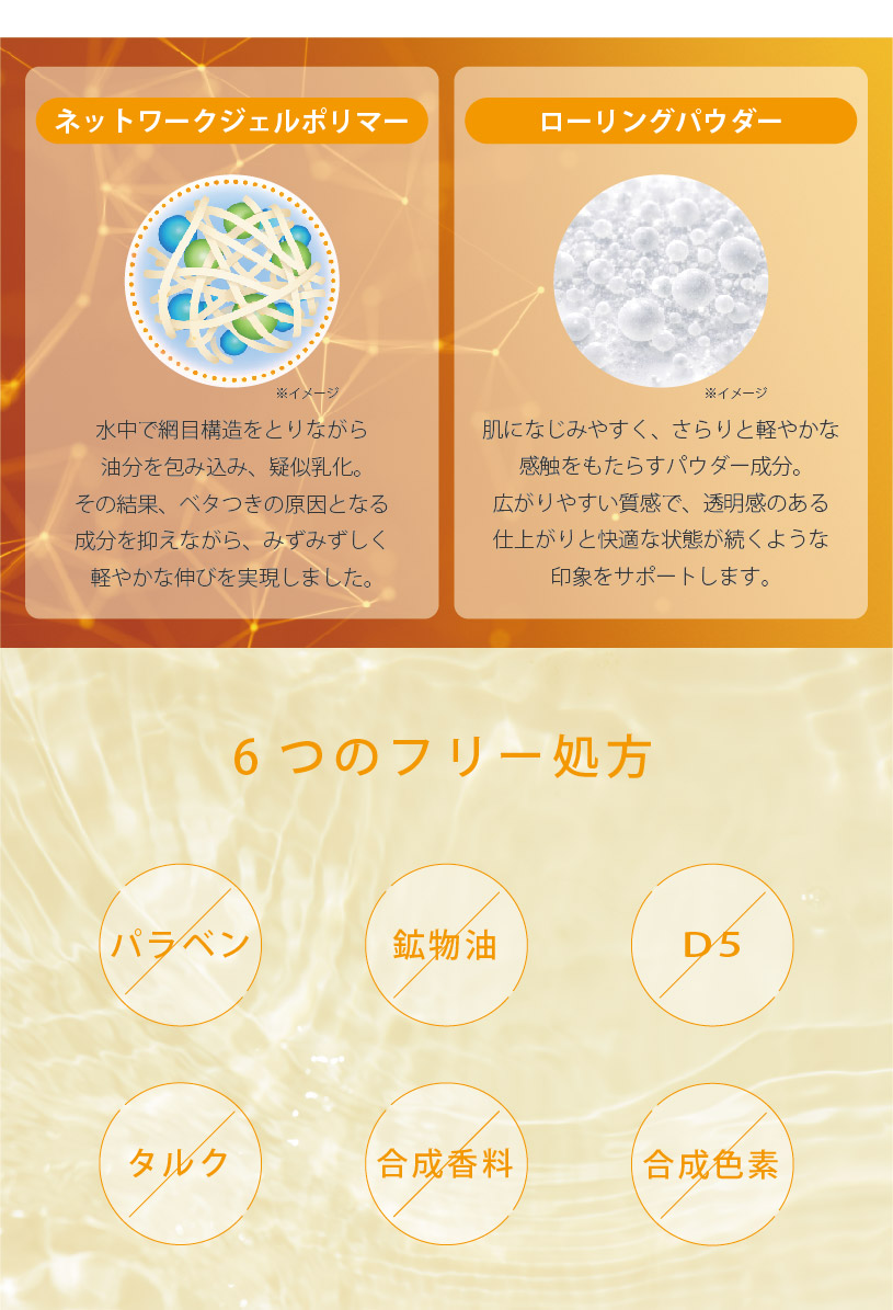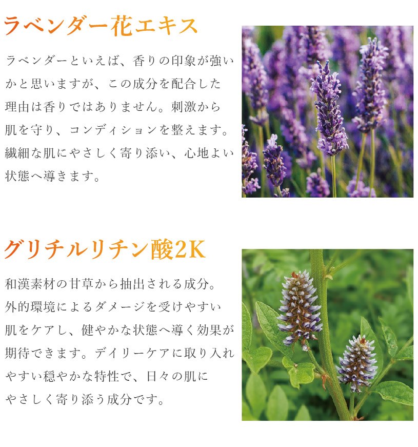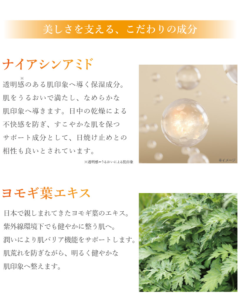 | 全成分 | : | 水、メトキシケイヒ酸エチルヘキシル、安息香酸アルキル(C12-15)、エタノール、BG、ポリメタクリル酸メチル、ビスエチルヘキシルオキシフェノールメトキシフェニルトリアジン、ジグリセリン、ジエチルアミノヒドロキシベンゾイル安息香酸ヘキシル、エチルヘキシルトリアゾン、ジメチコン、ポリソルベート60、ナイアシンアミド、(アクリロイルジメチルタウリンアンモニウム/VP)コポリマー、(VP/エイコセン)コポリマー、フェノキシエタノール、(アクリレーツ/アクリル酸アルキル(C10-30))クロスポリマー、テトラヘキシルデカン酸アスコルビル、水酸化K、グリチルリチン酸2K、ペンテト酸5Na、ツボクサエキス、グルタチオン、プラセンタエキス、シゾサッカロミセスポンべエキス、コウヤマキ枝/葉エキス、ヨモギ葉エキス、ラベンダー花エキス、メアカンキンバイカルスエキス